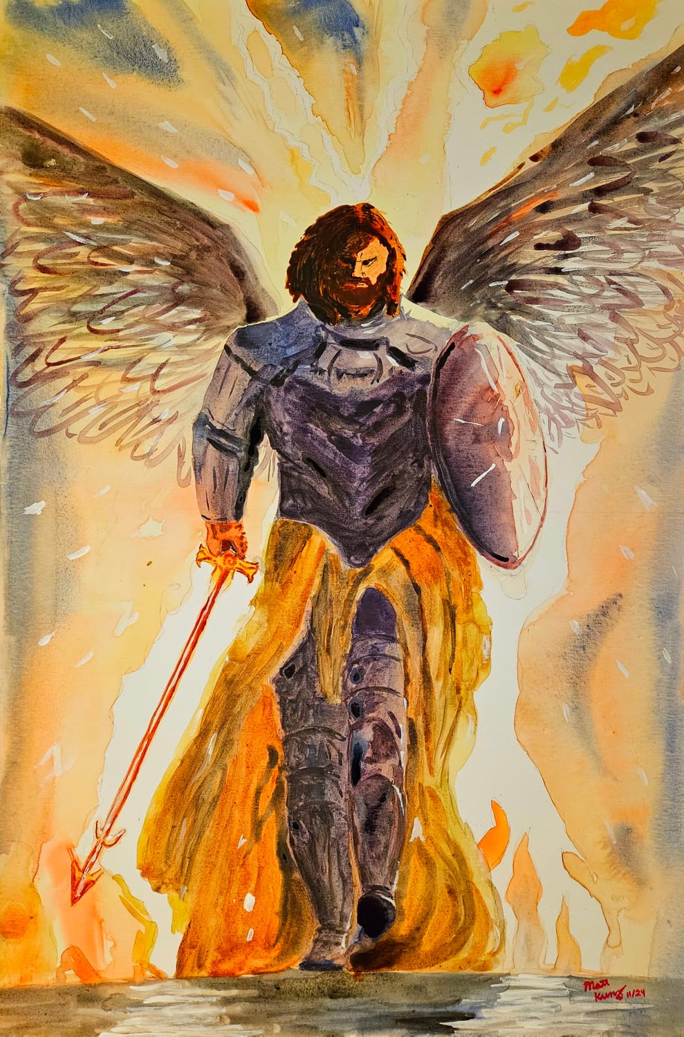 So, I said, "Saint Michael, show me how you want to look in this painting." I went though some sketches, developed my plan, and went to work. A few surprises came. First, Saint Michael appeared not as a happy angel, but as an angel with an attitude. He's like an older brother coming to the defense of his little brothers and sisters, and he's not happy at whoever is causing trouble for them. Also, he has a beard, which was a surprise. Hey, if it works in art go with it!