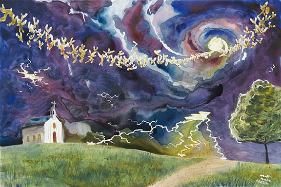 With Saint Michael finished, he overlooked my next piece, an image I call "Faith." This piece came about from something I often imagine during sunsets. When the day is about over and night approaches, I look west and imagine an army of angels getting ready to come to defend God's faithful. This piece grew into an intense scene, with a small church bombarded by storms, yet above the threat comes the power of Heaven.